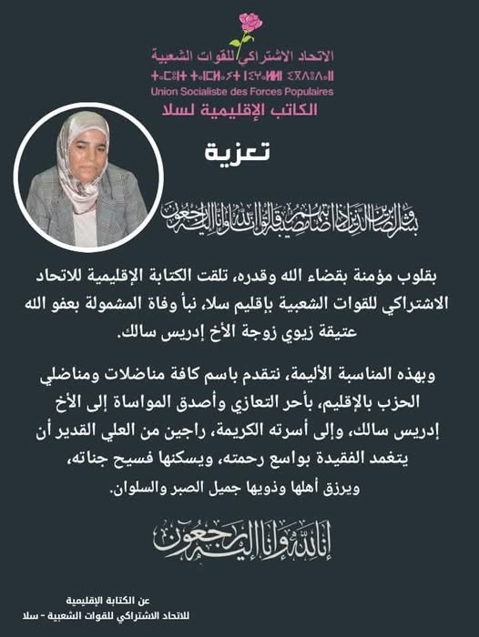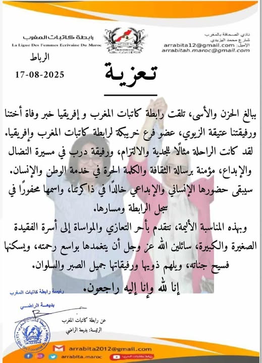 ·بقلوب مؤمنة بقضاء الله وقدره تلقينا نبأ وفاة أختنا وصديقتنا المسماة قيد حياتها ” الدكتورة عتيقة الزيوي” زوجة أخينا إدريس السالك .فباسم عضوات رابطة كاتبات المغرب وإفريقيا فرع خريبكة نتقدم بأصدق التعازي و المواساة لأخينا ادريس السالك ولابنتيها فرح و هاجر وابنها المهدي ولكافة أفراد عائلتها الكريمة ولصديقاتها وطلبتها . ندعو الله سبحانه وتعالى أن يشملها بألطافه وان يتغمدها برحمته الواسعة ويجعلها من أهل الجنة ويلهمنا وذويها الصبر والسلوان وإنا لله وإنا إليه راجعون .يا أيتها النفس المطمئنة ارجعي الى ربك راضية مرضية وادخلي في عبادي وادخلي جنتي // راضية بركات