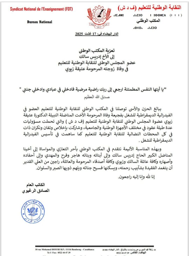 عزائي الحار في وفاة الاخت الفاضلة الحاجة عتيقة زيوي رحمها الله. اختنا المناضلة الهادئة أكرم الله مثواها وجعل الجنة مقامها ومأواها وعزاؤنا واحد في فقدانها لاخينا زوجها ادريس سالك عضو المجلس الوطني حاليا للنقابة الوطنية للتعليم والمكتب الوطني سابقا. اللهم اجعل قبرها روضة من رياض الجنة.والهم زوجها الاخ الحاج ادريس سالك الفاضل وابنها وبناتها الفضلاء وذويها جميل الصبر وعظيم السلوان انا لله وانا اليه راجعون/ نجية عبد الكريم